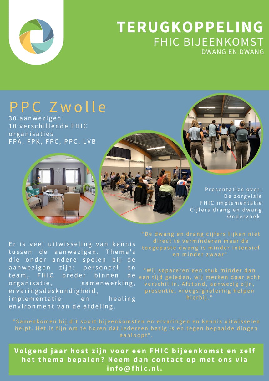 Op 3 oktober 2023 vond de FHIC bijeenkomst bij PPC Zwolle plaats. Het thema van de bijeenkomst: drang en dwang. Een geslaagde bijeenkomst waarbij tien van de aangesloten FHIC instellingen aanwezig waren.