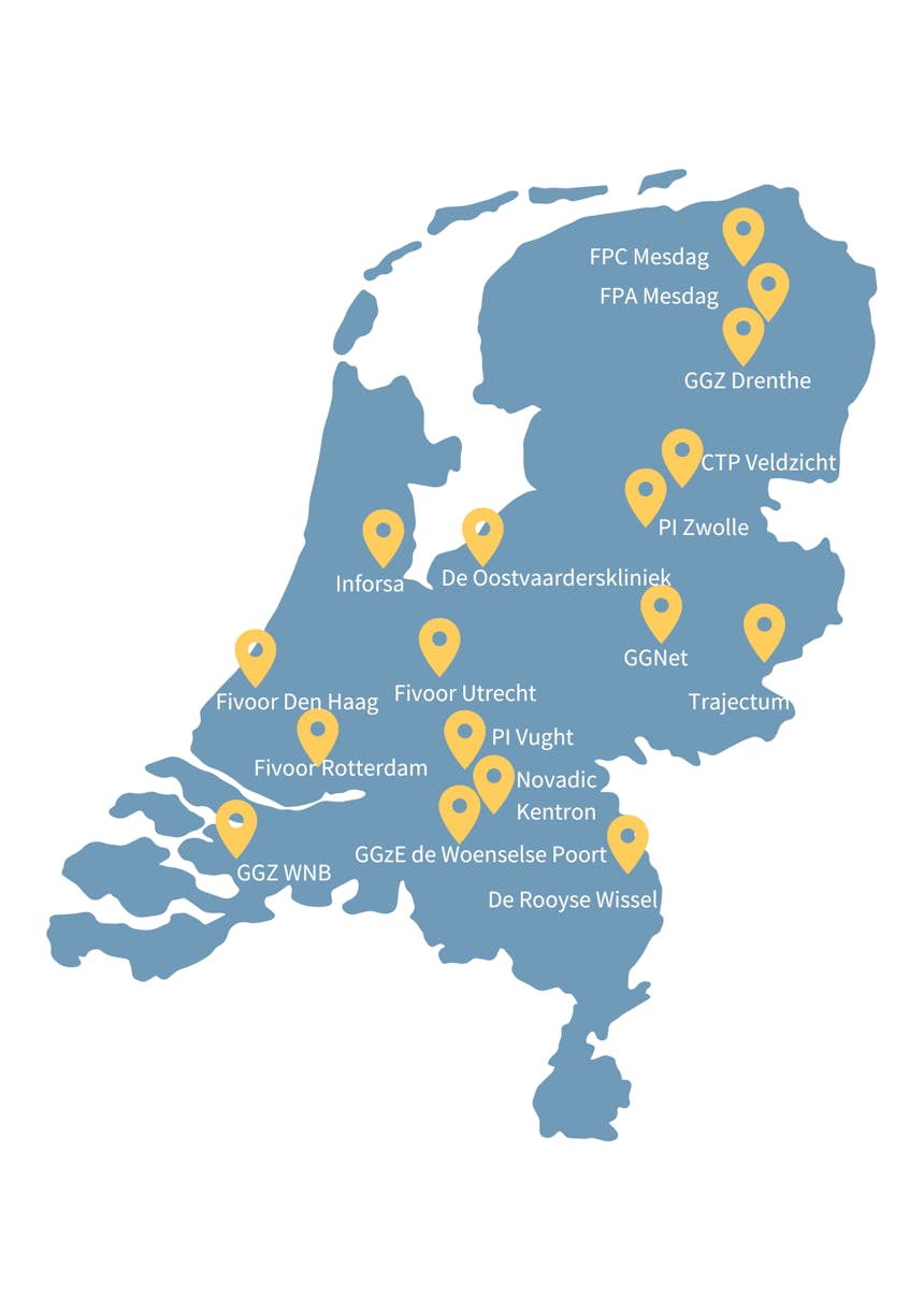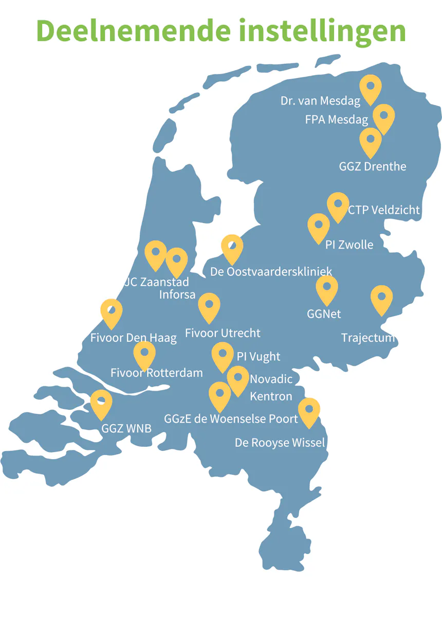 In onderstaande landkaart vind je een overzicht van alle deelnemende instellingen. Het netwerk is een doorontwikkelproject. Hier zal binnenkort meer informatie over beschikbaar zijn.